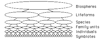 Now, life isn't really a nicely organized hierarchy. Charts like these are in themselves gross over-simplifications. A clean model is a useful tool to work with in making sense out of things. However reality consist just as much of cross-associations. Parts of wholes might associate with parts of other wholes, thereby creating new wholes that can again be split into parts, and so forth ad infinitum. That is what makes life a challenging puzzle. But the tool of looking at one holarchy or one holon at a time can be valuable in figuring things out. Each Holon can be considered an integral entity. It connects upwards towards bigger wholes and downwards towards smaller parts.